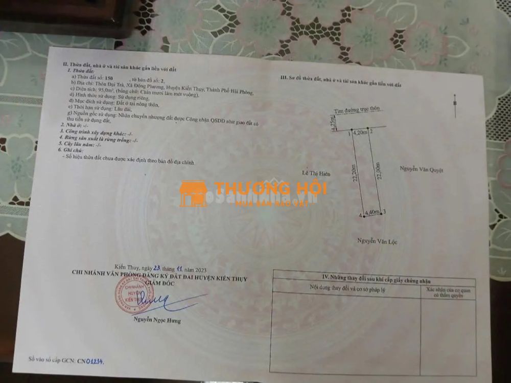 Lô đất vị trí đẹp tại thôn Đại Trà, xã Đông Phương, huyện Kiến Thụy.Diện tích 95m2, mặt tiền 4.2m nở hậu, pháp lý sổ đỏ sẵn sàng giao dịch.Khu dân cư hiện hữu, thuận lợi an cư hoặc đầu tư lâu dài.Trục đường nhựa rộng, kết nối nhanh ra đường 363 và dự án Vinhomes.Kinh doanh nhỏ lẻ, cửa hàng, dịch vụ đều phù hợp.Giá chỉ 2.5x tỷ – liên hệ ngay để xem đất và chốt cọc nhanh.