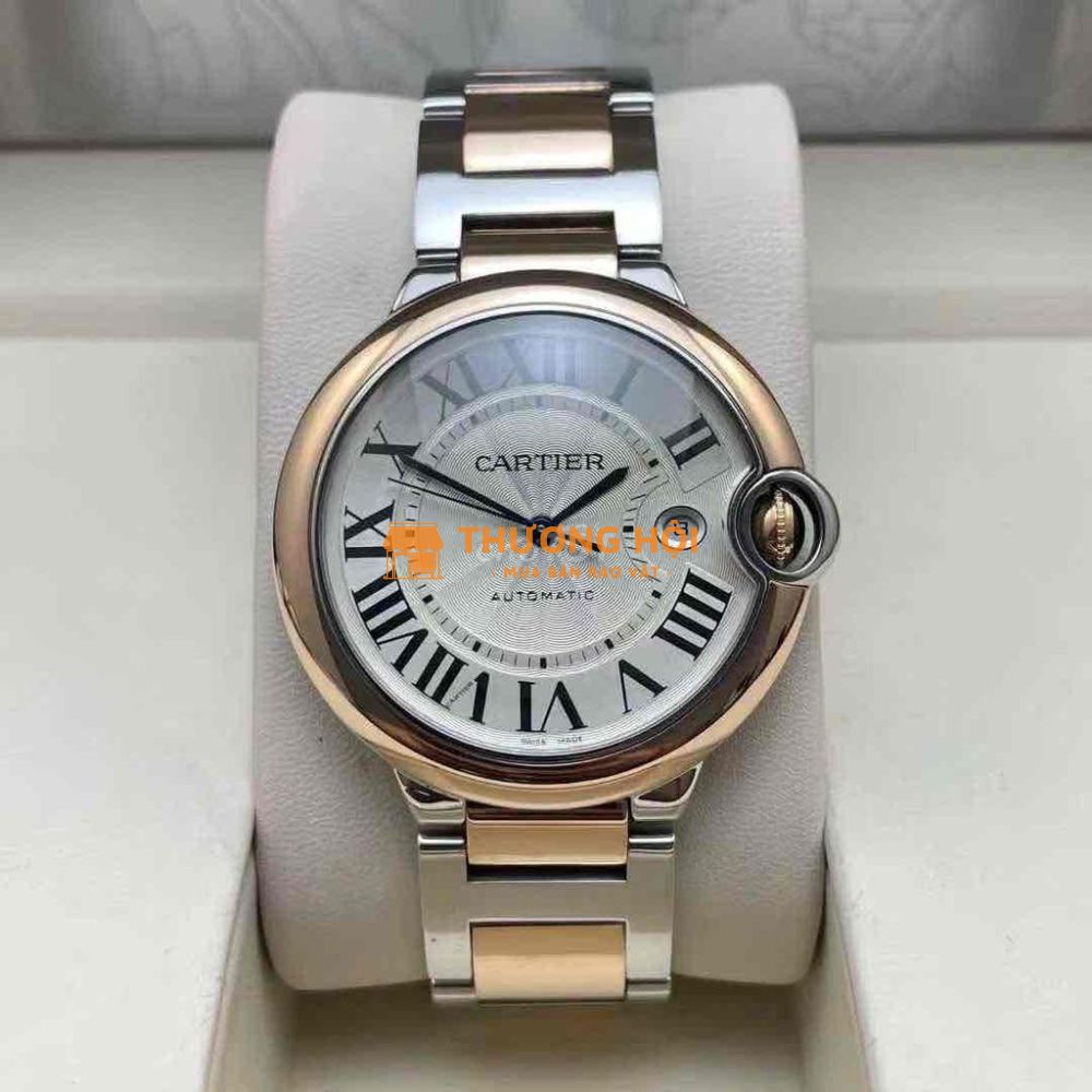 Cartier Ballon Bleu De Cartier W2BB0022 Watch size 42mm Đồng hồ Ballon Bleu de Cartier, 42 mm, chuyển động cơ học lên dây tự động. Vỏ thép, núm vặn bằng vàng hồng 18K được trang trí bằng cabochon Spinel tổng hợp, mặt số đục guilloché màu bạc, chữ số La Mã, kim hình thanh kiếm bằng thép xanh, mặt kính sapphire, vòng đeo tay bằng thép và vàng hồng 18K, lịch ngày ở vị trí 3 giờ. Kích thước vỏ: đường kính: 42,1 mm, độ dày: 13 mm. Chống nước ở áp suất 3 bar (khoảng 30 mét). 🌟Giao lưu 159tr