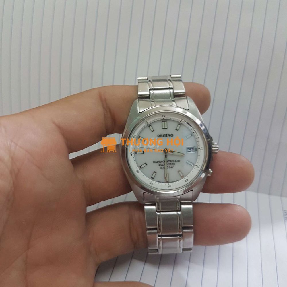 Đồng hồ Reguno Citizen Radio Controlled Solar Teach mới đẹp, dây vỏ thép không gỉ đúc đặc đeo rất đầm tay, toàn bộ rin nguyên bản, hoạt động tốt tất cả các chức năng, sử dụng pin Solar năng lượng ánh sáng tự sạc không cần thay pin, pin khoẻ, lịch vạn niên hàng tháng không cần chỉnh máy tự động cập nhật năm nhuần tháng thiếu, size mặt 38mmx40mm, kim cọc số dạ quang sáng rực rỡ vào ban đêm, chống nước 100m, rửa tay đi mưa bình thường. • Giá niêm yết bán tại nhà Hcm, ở xa chuyển khoản đủ đi đơn + 20k bao ship.