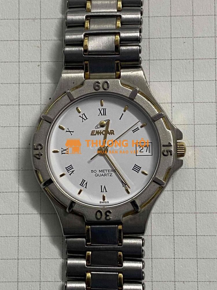 Đồng hồ Enicar Swiss Quartz – Chính hãng, chạy chuẩn Cần bán đồng hồ Enicar chính hãng, máy Quartz Thụy Sĩ, mã số 955.380 – ✅ Máy chạy ổn định, lịch ngày rõ ràng ✅ Dây demi zin chính hãng, khóa có logo Enicar ✅ Vỏ thép phối vàng sang trọng, chống nước 50 mét ✅ Mặt trắng, số La Mã cổ điển, phong cách thể thao – lịch sự 🔸 Kích thước vừa tay, phù hợp cả nam văn phòng hoặc đi chơi 🔸 Hàng nội địa, hiếm gặp tại Việt Nam 💰 Giá: 950.000 VNĐ