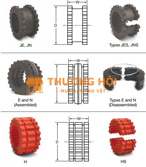 1. Cấu tạo: Bao gồm hai mặt bích (flanges) bằng kim loại có răng bên trong, và một ống bọc đàn hồi (sleeve) bằng cao su tổng hợp (Neoprene, EPDM) hoặc Hytrel có răng bên ngoài để ăn khớp.