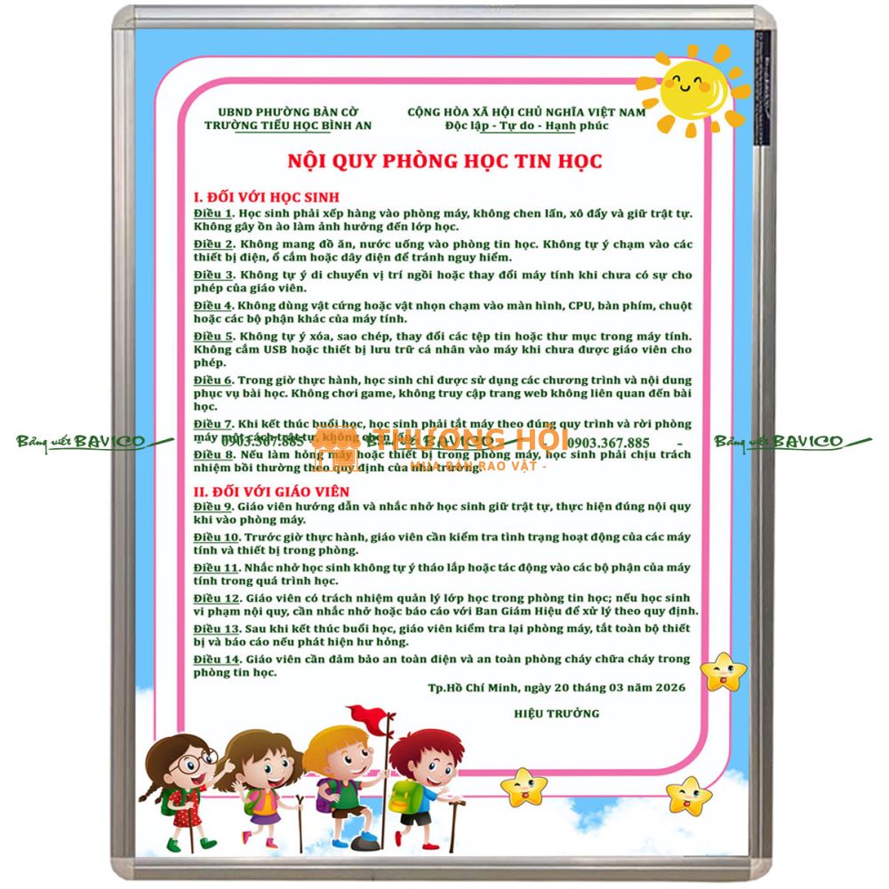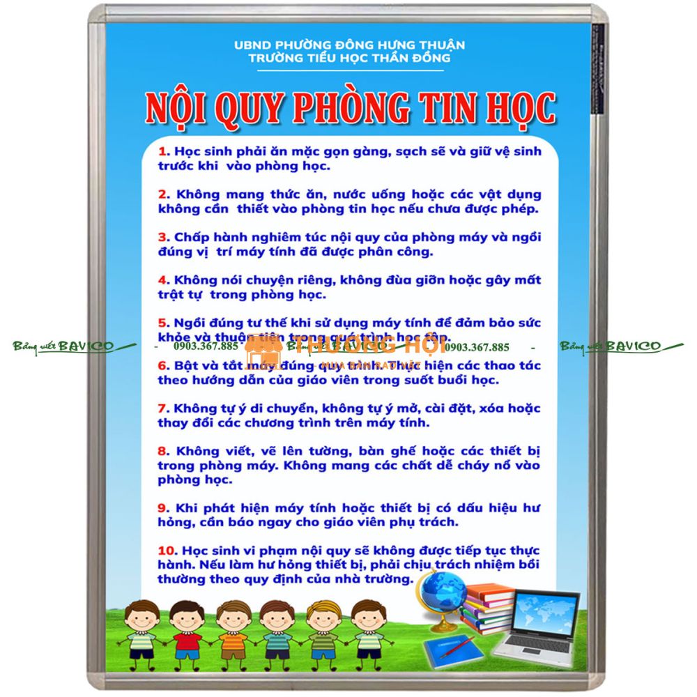 Hiện nay, BẢNG NỘI QUY PHÒNG TIN HỌC của BAVICO đang được nhiều trường học, trung tâm đào tạo và cơ sở giáo dục lựa chọn bởi thiết kế đẹp, nội dung rõ ràng và độ bền cao. Đây là giải pháp hiệu quả giúp quản lý phòng máy một cách khoa học và chuyên nghiệp.