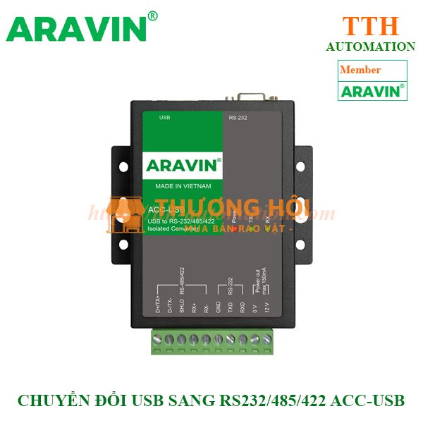 ACC-USB Aravin là bộ chuyển đổi USB sang RS232/RS485/RS422 thuộc dòng sản phẩm kết nối truyền thông do Aravin sản xuất tại Việt Nam, được tích hợp cách ly, giúp kết nối tin cậy hơn trong công nghiệp: vừa chuyển đổi tín hiệu, vừa tăng an toàn nhờ cách ly, đồng thời hỗ trợ khoảng cách truyền xa và dễ triển khai qua cổng COM ảo.